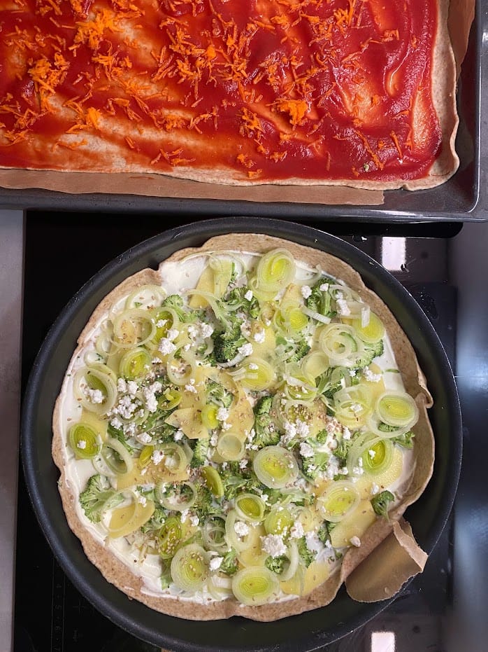 - Sprinkle the pizza with olive oil and place in a 220°C oven until golden brown.